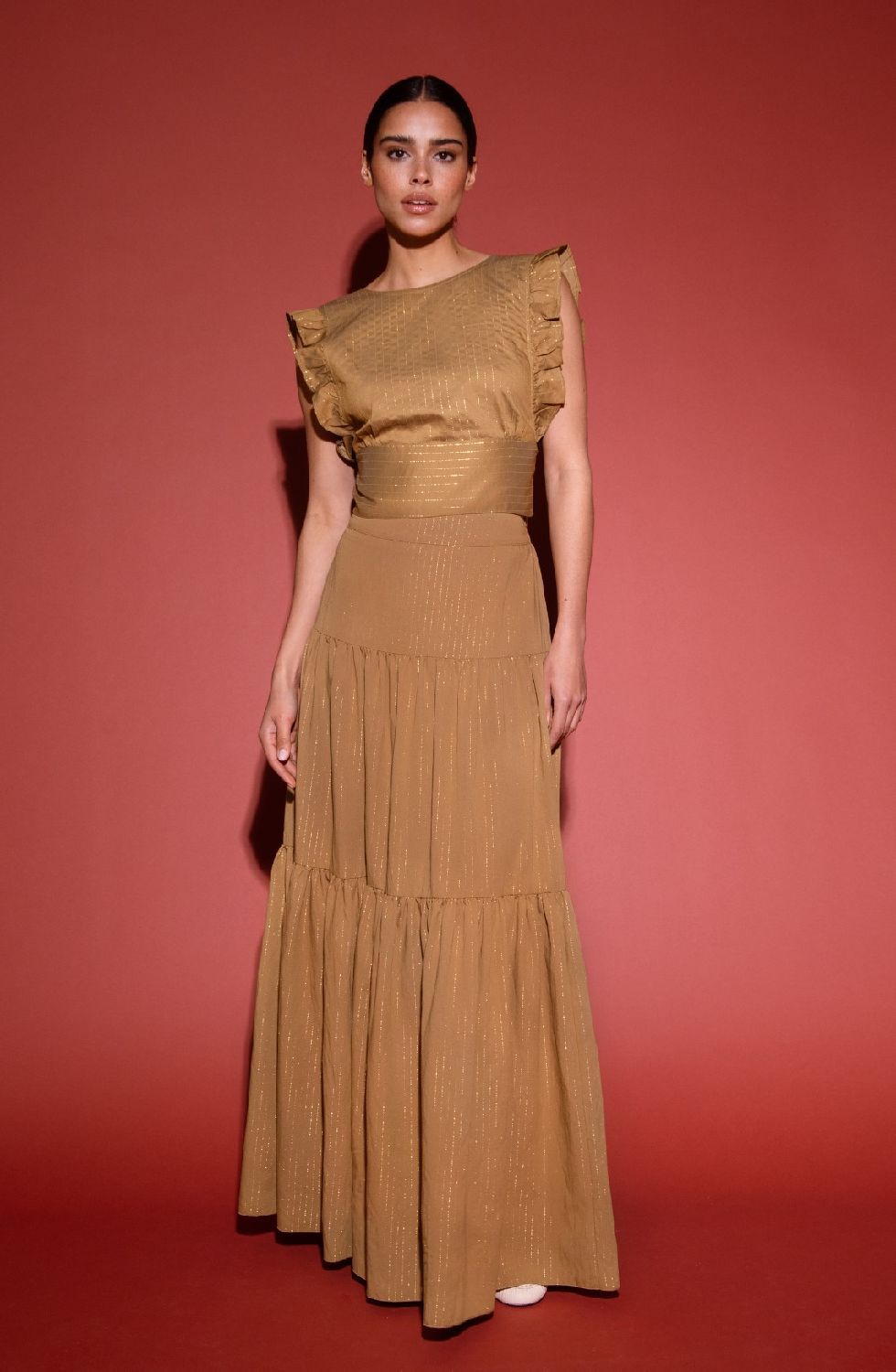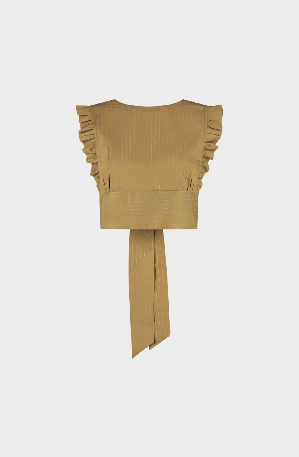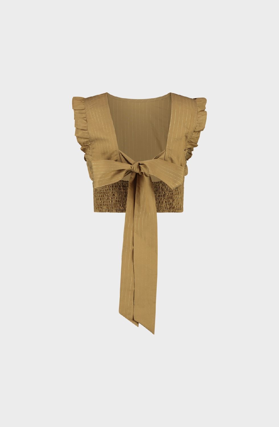 Het model is 173 cm en draagt maat S.Maat: Normale pasvorm. Wij adviseren om uw eigen maat te nemen.Product informatie: De Dillia Top is onze favoriete zoer top. De zacht bruine kleur van de stof heeft een subtiele gouden lurex draad erdoor lopen, dit geeft een glanzend effect aan de rok. De tailleband is elastisch, dit zorgt voor een comfortabele fit en brede pasvorm. Het viscose materiaal heeft een luchtige en natuurlijke uitstraling. De Wow-Factor van de top is d eprachtige open rug, met strik. De band valt over de BH, dus je kan het met of zonder BH dragen. Het ruches moutwtje valt net op/over de schouder.The power of matching sets: Combineer de Dillia Top met de Ceddy of Pearl Skirt voor de complete set. Belangrijk: ?Dit item niet stomen, alleen strijken op lage stand. Meer informatieMateriaal:87% Viscose 13% NylonWasadvies:Om je kleding mooi te houden, heeft het item wat je hebt besteld liefde, aandacht en verzorging nodig. Het beste zou zijn om je kledingstuk nooit te wassen, maar we begrijpen dat je kledingstuk een opfrisbeurt nodig heeft. Was je kledingstuk daarom altijd op koud en laag centrifugeer stand en stop het nooit in de droger. Het item niet stomen, alleen strijken op lage stand.P.S. Elk kledingstuk heeft zijn eigen wasvoorschriften. Dit is een extra tip vanuit ons, dus kijk altijd goed op het waslabel van jouw bestelde item.