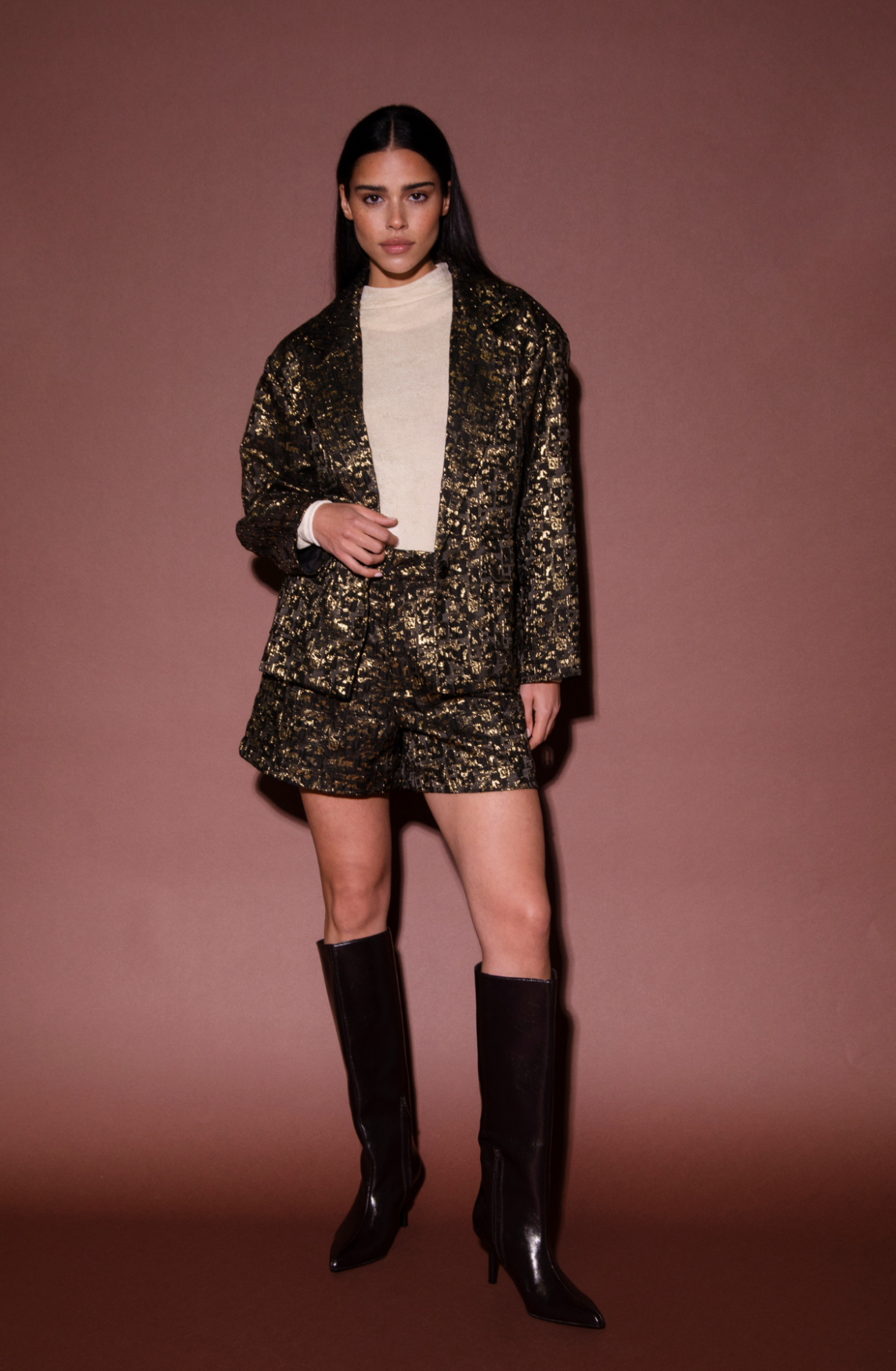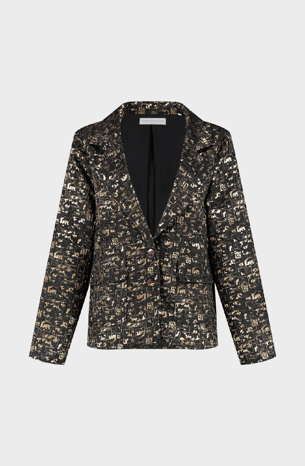 Maat: Normale pasvorm. Wij raden aan je eigen maat te nemen.Productinformatie: Een feestelijk en toch goed te combineren item, het Janna Jacket. Zowel ontzettend leuk naar werk op een stoere jeans, als in de complete set met een mooie hak/laars en je bent klaar voor alles! Het zwarte materiaal, gemixt met goud geeft het item een feestelijke uitstraling.The power of matching sets: Combineer met de Jef Short voor een complete look.Meer informatieMateriaal:100% Polyester
