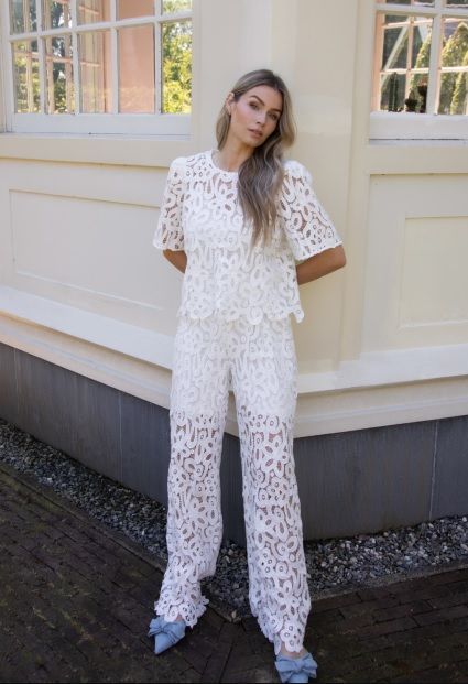 Het model is 174 cm lang en draagt ??maat S. Maat: Regular fit. Wij adviseren je eigen maat te nemen. Productinformatie: De Meggan Blouse is dé zomertop, volledig gemaakt van kant. De mouwen en onderkant eindigen ook in kanten schelpjes, wat een uniek effect geeft. De Meggan Blouse heeft een hoge ronde hals en kan aan de achterkant gesloten worden met een knoopje. Aan de top zit een ondertop bevestigd, die je eronder kunt dragen of niet. De lengte valt tot aan de tailleband. De kracht van bijpassende sets: Combineer de Meggan Blouse met de Mitch Pants voor een complete bijpassende setlook.Materiaal: Buitenkant: 100% polyester - Voering: 95% viscose 5% elastaanWastip:Om je kledingstuk mooi te houden, heeft het liefde, aandacht en verzorging nodig. Het beste is om je kledingstuk nooit te wassen, maar we begrijpen dat je kledingstuk wel een opfrisbeurt kan gebruiken. Was je kledingstuk daarom altijd koud en op een lage centrifugeerstand en doe je kledingstuk nooit in de droger. PS Elk kledingstuk heeft zijn eigen wasvoorschriften. Dit was slechts een tip van ons, dus controleer het waslabel zorgvuldig.