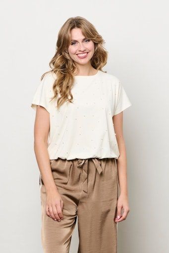Deze top met ronde hals, aangeknipte mouw is gemaakt in een katoen-modal kwaliteit met geplaatste parels op voorpand.Extra details zijn:Ronde halsAangeknipte mouw.Elastiek in de zoom.Geplaatste parels op voorpand in verschillende formaten.Leuk in combinatie met de verschillende onderstukken van &Co Woman.Materiaal: 48% Modal - 48% Katoen - 4% Elastaan Wasvoorschrift: Machinewas max. Fijnwas 30 graden Celsius. Niet in droger