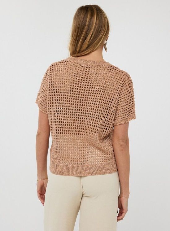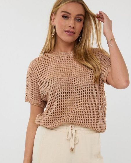 Glinsterende open knit top doorweven met lurex. Draag deze gave top over een hemdje, een huidskleurige bh of over je bikini. Model is 1.73m en draagt maat S.Materiaal 60% acrylic 40%polyester