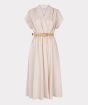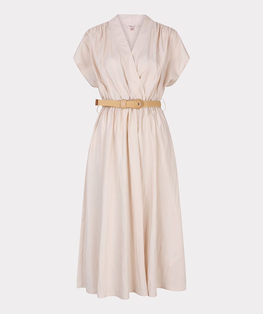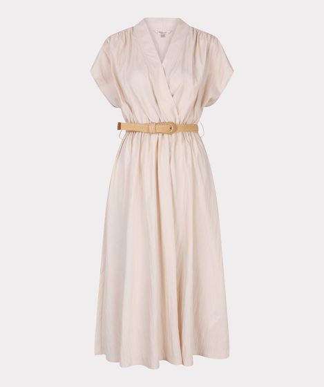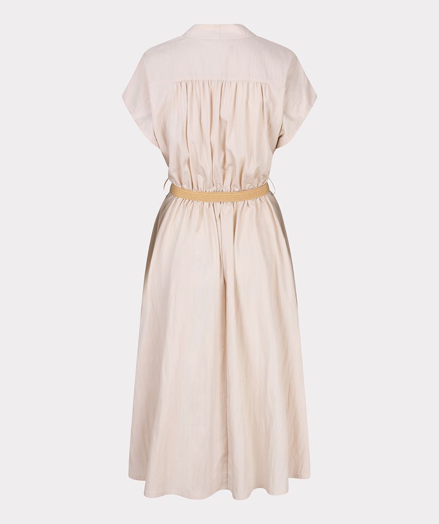 Elegante a-line jurk met plooidetail en steekzakken. Deze jurk brengt elegantie en comfort samen in een ontwerp. Het riempje dat de taille accentueerd is inbegrepen bij de jurk. De jurk bestaat uit 70% viscose en 30% nylon.