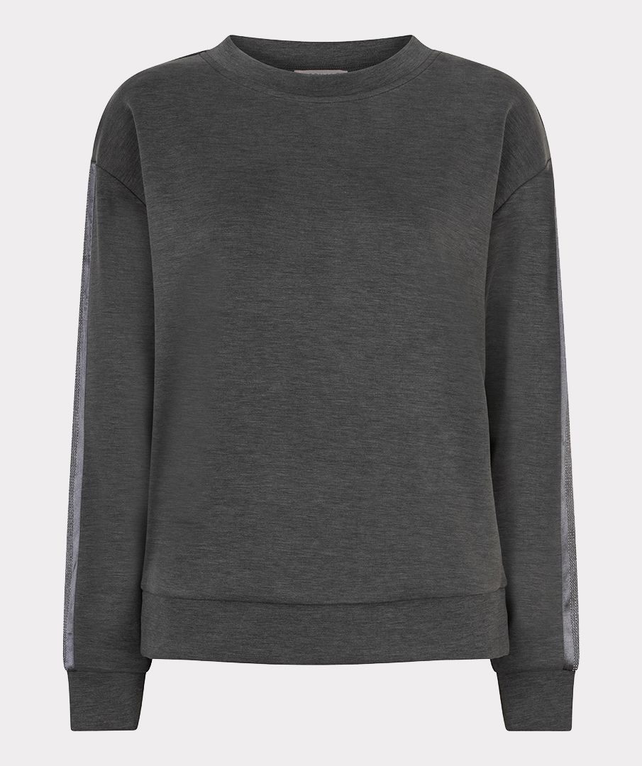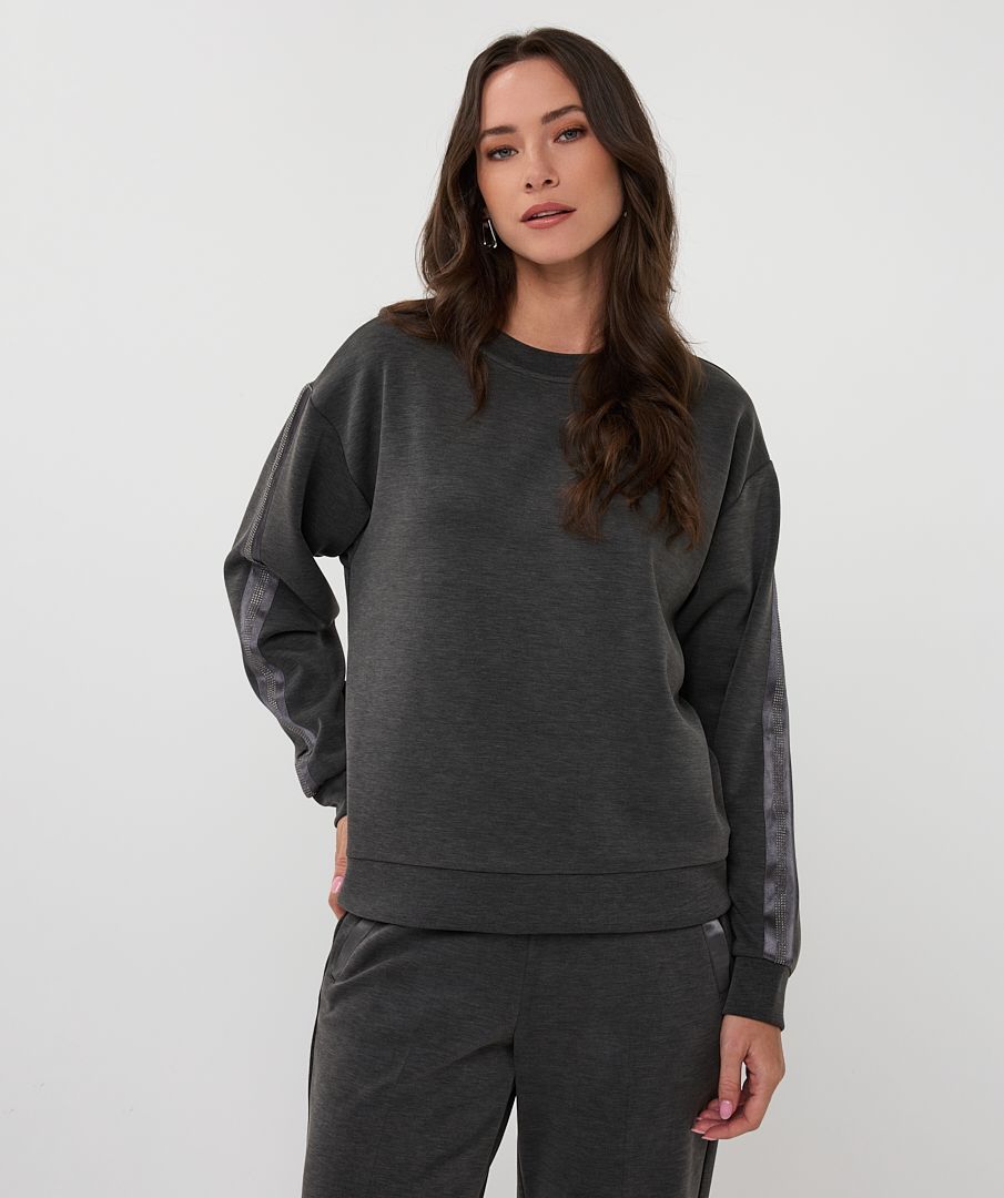Stoere comfortabele modal trui. Deze trui heeft een satin streep detail op beide mouwen met prachtige strass steentjes. Model is 1.73m en draagt maat S.Materiaal 48% Modal - 48% Polyester - 4% Spandex