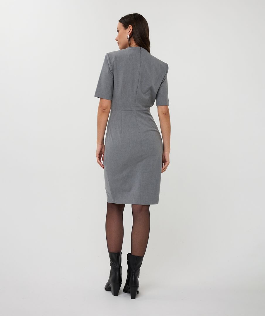 Deze nette jurk is ideaal voor op het kantoor of een diner in de stad. De jurk heeft een split aan de voorzijde en een zilveren gesp in de taille, hierdoor plooit de stof en heeft de jurk een mooi zandloperfiguur. Model is 1.73m en draagt maat S.Materiaal 68% Polyester - 28% Viscose - 4% Elastane