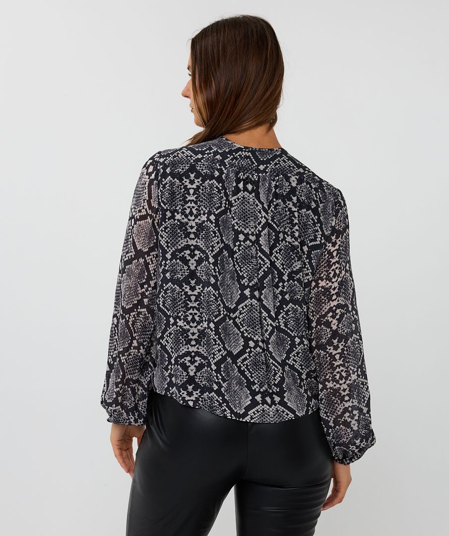 Prachtige blouse in slangenprint met strik in de hals. De blouse is gevoerd en is gemaakt van 100% viscose. Model is 1.73m en draagt maat S.