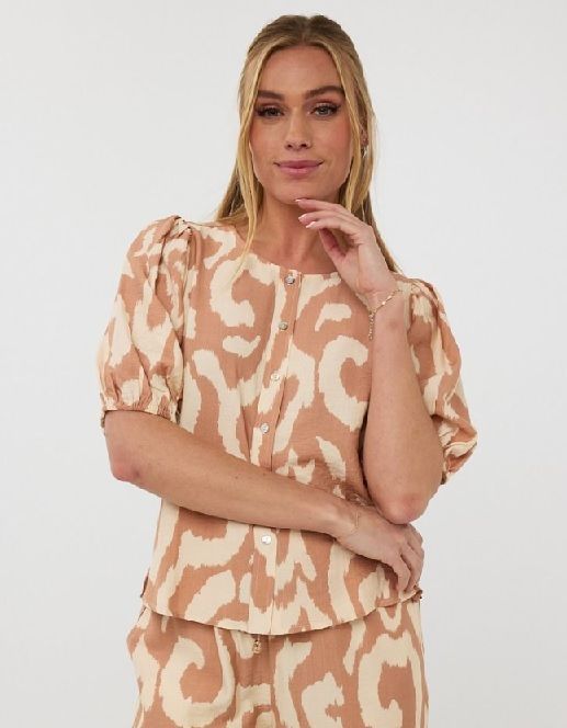 Blouse met lichte pofmouw in onze Solar Swing print. Deze blouse draagt luchtig door de combinatie van 88% rayon en 12% nylon. Maak de set compleet met de bijpassende broek. Model is 1.73m en draagt maat S.Materiaal 88%rayon 12%nylon