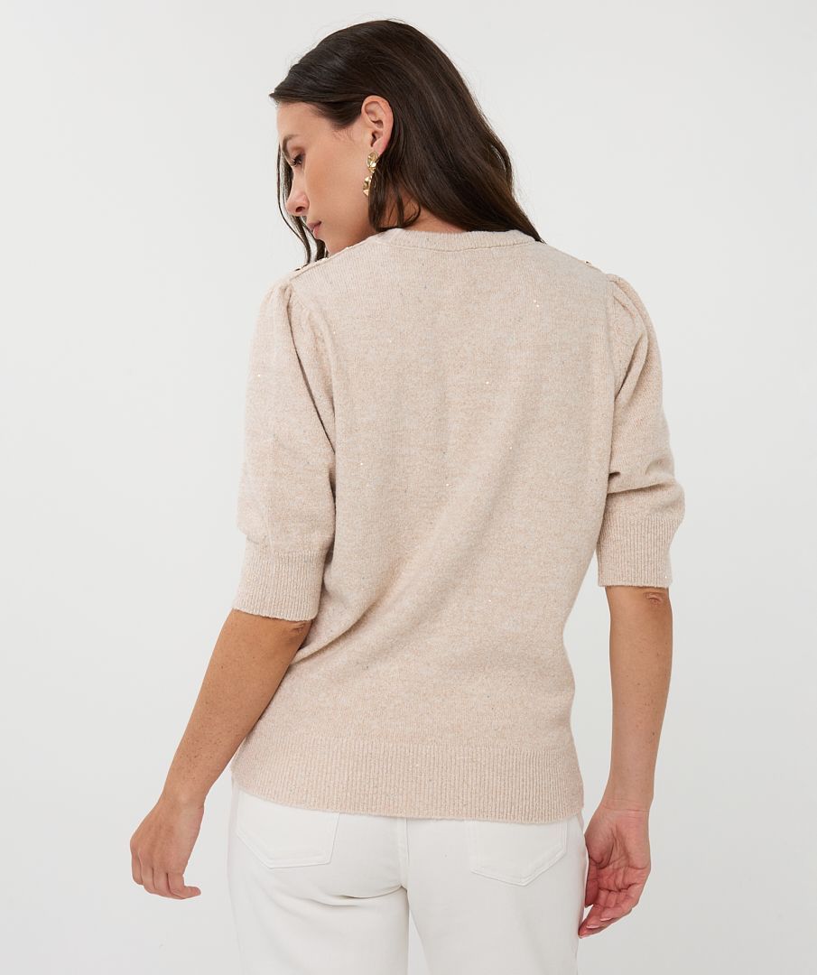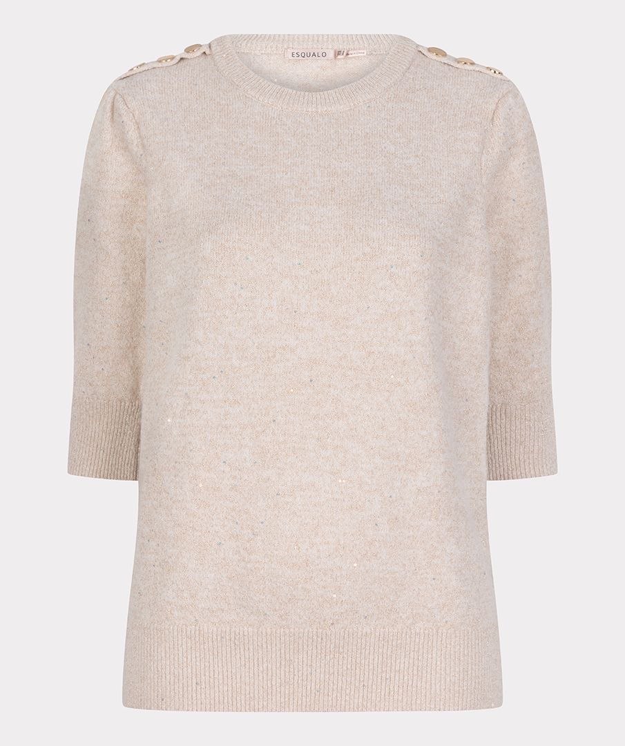 Fijn gebreide trui met gouden knoopjes op beide schouders en kleine glinsterende pailletjes. De trui is gemaakt van 60% gerecycled polyester, 37% polyester en 3% spandex. Model is 1.73m en draagt maat S.V