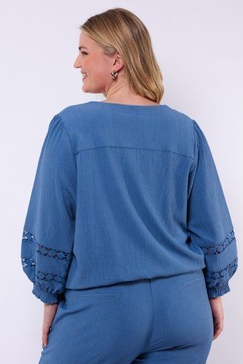 Een vrouwelijke essential met een zachte en elegante uitstraling. De Capry top heeft een losvallende pasvorm met een flatterende V-hals en een comfortabele, soepelvallende kwaliteit die prettig aanvoelt op de huid. De sierlijke kanten inzet op de mouwen en de subtiel gesmokte boord geven het ontwerp een verfijnde en romantische touch. Een geliefd item binnen onze collectie, jouw Exxcellent Choice.