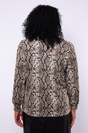De Ella top is een echte eyecatcher dankzij de trendy slangenprint. De hoge hals met plooidetail en de soepelvallende stof geven dit item een moderne en elegante uitstraling. Met de elastische manchetten krijgt de mouw een mooi volume, wat de top een extra vrouwelijke touch geeft. Perfect te combineren met een jeans of een nette broek voor een stijlvolle lookMateriaal Polyester 90%, Elastane 10%
