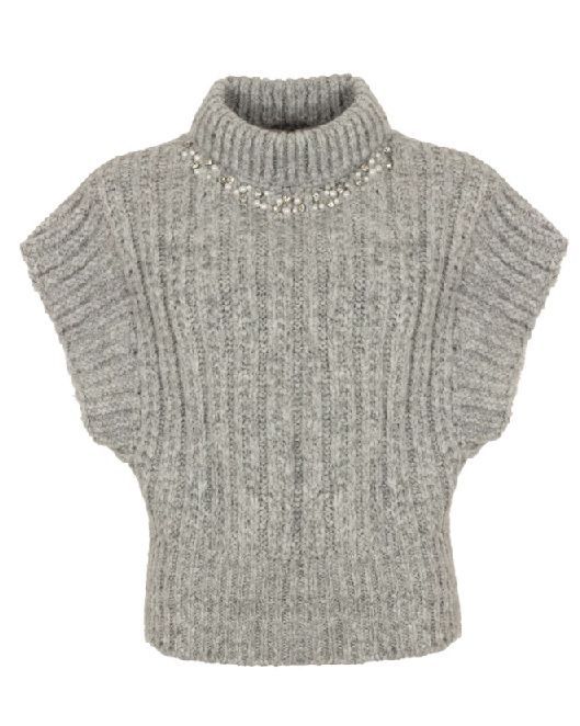 De Kalista Spencer is een eigentijdse, mouwloze knit die moeiteloos stijl en comfort combineert. Gemaakt van een zachte, hairy garenmix, voelt deze spencer warm en luxueus aan. De parel- en steendecoratie langs de halslijn voegt een verfijnde, vrouwelijke touch toe aan het grovere breisel. De hoge col en geribde structuur zorgen voor een moderne, ingetogen look.Perfect om te layeren over een blouse of jurk voor een elegante, gelaagde outfit tijdens de koudere maanden.Details:Mouwloze spencer met opstaande colZacht knitted hairy garenVersierd met parels en stenen bij de halsVerkrijgbaar in Black en Grey MelangeMateriaalsamenstelling: 62% acryl, 18% polyester, 8% viscose, 8% wol, 4% alpacaHet model is 175 cm en draagt maat S