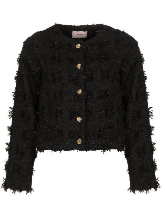 Een kort jasje met een luxe en tijdloze uitstraling.Het jasje is gemaakt van een verfijnde woven bouclé kwaliteit met een subtiel harig effect en glinsterende lurexdraden, wat zorgt voor een rijke en elegante look. De klassieke knoopsluiting en rechte pasvorm geven het ontwerp een stijlvolle, vrouwelijke uitstraling. Perfect te combineren met een pantalon of jurk voor een chique, moderne outfit.Details:Kort jasje met knoopsluitingWoven bouclé kwaliteit met harig effect en lurexLuxe, elegante uitstralingTijdloos en veelzijdig ontwerpMateriaalsamenstelling: 97% polyester, 3% katoenHet model is 179 cm en draagt maat SDit item valt klein; we adviseren een maat groter te bestellen.