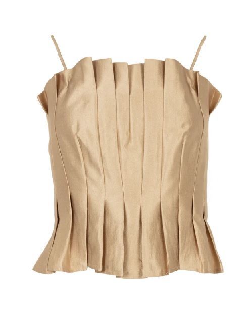 Deze bustier top is gemaakt van een luxe geweven stof met een verfijnde glans. De geplooide voorzijde geeft een elegant silhouet, terwijl de gesmokte achterkant zorgt voor een comfortabele pasvorm. De afneembare bandjes maken het mogelijk om de top op verschillende manieren te dragen.Details:• Geweven stof met subtiele glans• Bustier model met geplooid vouwdetail• Smock aan de achterzijde voor extra comfort• Verwijderbare schouderbandjes• Stofsamenstelling: 46% Viscose, 40% Polyamide, 14% Polyester• Het model is 1,76 m lang en draagt maat S