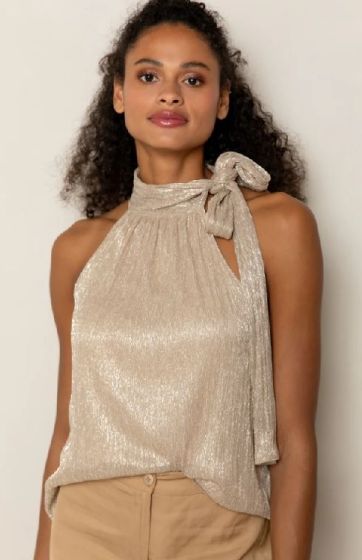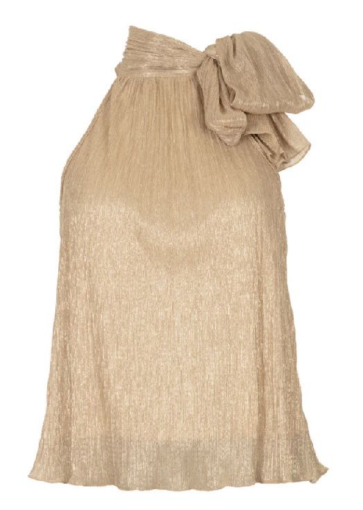 Deze feestelijke mouwloze top is gemaakt van een luxe lurex plissé stof met stretch, waardoor het een mooie glans en comfortabele pasvorm heeft. De top heeft een chique, hoge halslijn die zorgt voor een elegante touch. Perfect voor speciale gelegenheden of feestjes om je outfit een stijlvolle en opvallende look te geven.Bijzonderheden:Mouwloze topHoge halslijnFeestelijke lurex plissé stof met stretchSamenstelling: 55% metaal, 45% polyesterHet model is 175 cm lang en draagt maat S