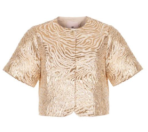 Een elegant jasje met een luxe uitstraling. Dit jasje is uitgevoerd in een geweven jacquard kwaliteit zonder stretch en heeft een verfijnde structuur met een subtiele glans. De blinde sluiting zorgt voor een strakke, minimalistische look, waardoor de stof en het silhouet volledig tot hun recht komen. Perfect om een outfit een chic accent te geven.Details:• Geweven jacquard kwaliteit zonder stretch• Kort jasje met korte mouwen• Blinde sluiting voor een clean design• Luxe, gestructureerde uitstraling• Stofsamenstelling: 85% Polyester, 15% Polyamide• Het model is 1,76 m lang en draagt maat S