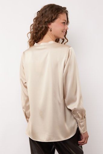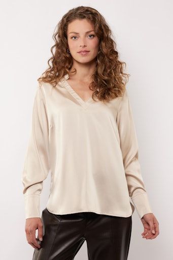 De Sigourney top is een verfijnde basic met een elegante V-hals en een subtiele glans in de stof. De lange mouwen zijn afgewerkt met brede manchetten voor een vrouwelijke touch. Deze top is perfect voor zowel een casual als een geklede look en laat zich eindeloos combineren binnen je garderobe.Material Polyester 100%