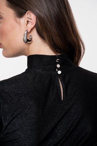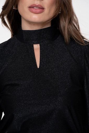Fit: Aangesloten pasvormKraag: ChokerneckMouwen: Subtiele pofmouwen met smalle cuffsPrint: LurexDetails: Valt op de heupModel is 176cm lang en draagt maat S/36Artikelnummer: 52564-47Materiaal80% polyester , 15% metallic fiber , 5% elasthane