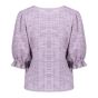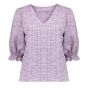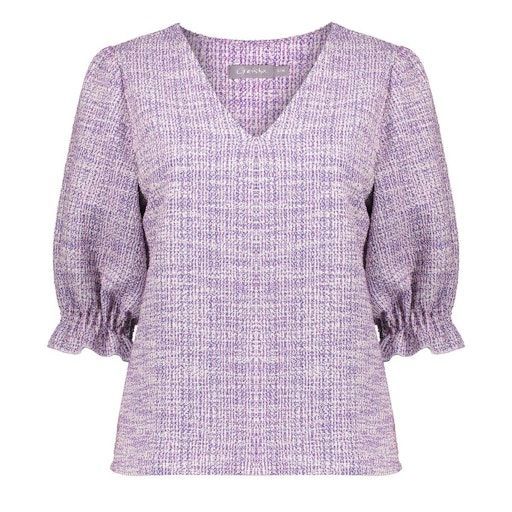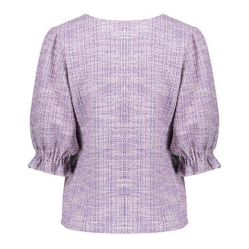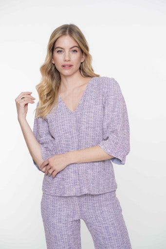 Deze top is een onderdeel van onze S25-1 collectie.Fit: RechtvallendKraag: V-halsMouwen: Drie kwart mouwen met ruffles aan de manchettenPrint: Tweed geweven met melange garensModel 179 cm lang en draagt maat S/36.Materiaal 40% cotton, 40% polyester, 18% viscose, 2% elastane