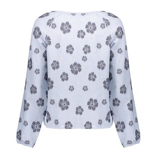 Deze top is uitgevoerd in cloud blue met een subtiele streepstructuur en een artistieke bloemenprint. De sierkoordjes met kwastjes bij de hals geven een speelse, verfijnde touch. De luchtige kwaliteit en ontspannen fit maken dit item ideaal voor de zomer.Rechte, losse pasvormRonde halsSierkoordjes met kwastjeModel is 178 cm lang en draagt maat S/36