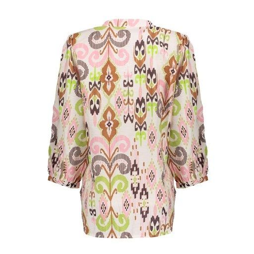 Deze blouse is een frisse eyecatcher met een sierlijke grafische print in zachte tinten. Het rechtvallende model en de ronde boord geven een vrouwelijke uitstraling. De 3/4 pofmouwen met zoom en subtiel tapedetail op de mouw zorgen voor een speels accent. Perfect te combineren met een lichte jeans of zomerse pantalon.Rechte, losse vallingVolledig doorgeknooptRonde halsSierlijke paisleyprintModel is 178 cm lang en draagt maat S/36