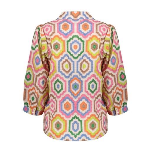 Deze blouse is uitgevoerd in een zachte crèmekleurige basis en verrijkt met een multicolor tegeltjesprint. De speelse combinatie van roze, blauw, groen en oranje geeft het ontwerp een frisse, zomerse uitstraling. Afgewerkt met een kraag die uitloopt in een V-snit, knoopsluiting en driekwartmouwen.Rechte vallingVolledig doorgeknooptTegelprint