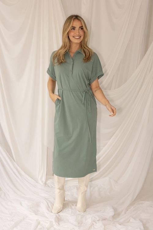Merlijn DressDe Merlijn Dress is een moderne, luchtige jurk met een sportief-vrouwelijke uitstraling. Gemaakt van hoogwaardige Travel Medium kwaliteit voelt deze jurk glad, stretchy en licht aan. Dankzij de mix van 80% Polyamide en 20% Elastane blijft de stof perfect in vorm, kreukt ze nauwelijks en beweegt ze comfortabel met je mee, ideaal voor warme dagen, vakanties of een stijlvolle dagelijkse look.Het ontwerp heeft een polo-kraag met een halflange knoopsluiting voor een frisse, sportieve uitstraling. De korte, lichte cap-mouwen met vaste omslag geven de jurk een moderne, relaxte look. In de taille zit een verstelbaar koord, waarmee je het silhouet naar wens kunt tailleren, van los en soepel tot vrouwelijk getailleerd. De rechte rok met kleine zijsplitten zorgt voor bewegingsvrijheid en een elegante valling.Perfect te combineren met sandalen, sneakers of loafers voor een effortless zomerlook.Waarom je de Merlijn Dress wilt hebbenLuxe Travel Medium kwaliteit: licht, stretchy en kreukarmPolo-kraag met knoopsluiting voor een sportief-chic effectCap-mouwen met vaste omslag voor een moderne lookVerstelbaar taillekoord voor een flatterend silhouetIdeaal voor vakantie, werk en casual chic outfitsComfortabel én vormvast, de hele dag doorMateriaal: Travel Medium | 80% Polyamide, 20% ElastanePasvorm: Rechtvallend met aanpasbare tailleLengte: Midi / net over de knie (afhankelijk van lengte)Halslijn: Polo-kraag met knoopsluitingMouwen: Korte cap-mouw met omslagDetails: Taillekoord, lichte stretch, kleine zijsplittenWasvoorschriftVolg altijd het waslabel in het kledingstuk. Advies: was binnenstebuiten op een fijnwasprogramma en laat aan een hanger drogen om vorm en elasticiteit te behouden.Model Veerle is 1.73 m, draagt normaal maat S en draagt hier maat S van Kimara. De jurk valt op maat en beweegt comfortabel met je mee.