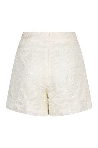 Short Candice is een short in de kleur gebroken wit. De witte short is gemaakt van een geborduurde stof en het design is subtiel versierd met pailletten. Het korte broekje heeft aan de achterkant een blinde rits. Draag de high waisted short als co-ord set met blouse Ivy.Materiaal: 100% polyester Model en fit: Het model is 1.74m en draagt maat S. De maat valt normaal Binnenbeenlengte short: 9 cm bij maat S