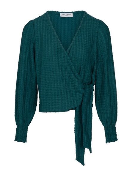 ArtikelinformatieTop Cirelle is een teal top met overslag en V-hals. De pofmouwen geven een vrouwelijke uitstraling. De top valt relaxed en sluit door de overslag mooi aan bij de taille. Een fijne top voor zowel een casual als geklede look.Materiaal: 86% polyester, 14% katoen