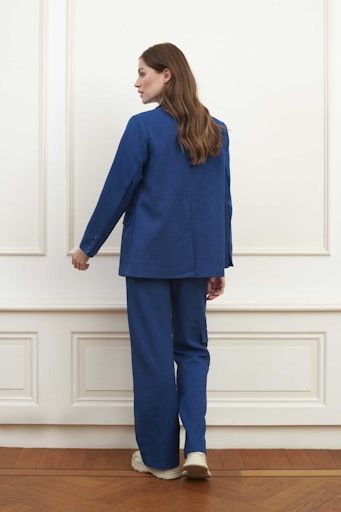Broek Deidra is een blauwe cargo broek met knoop- en ritssluiting, riemlussen en rechtvallende broekspijpen. De broek heeft een linnen look, een zak op de knie en steekzakken.Materiaal: 100% polyester Model en fit: Het model is 1.78m en draagt maat S Binnenbeenlengte broek: 81 cm bij maat S