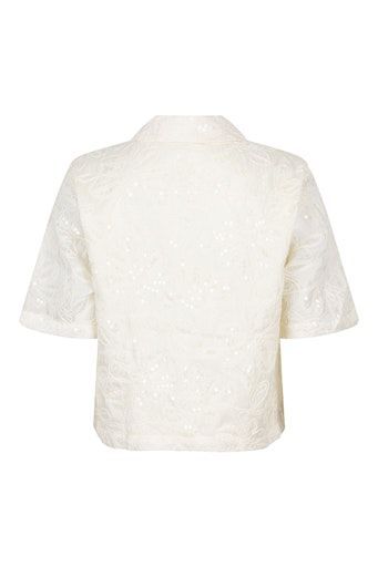 Blouse Ivy is een blouse in de kleur gebroken wit. De witte blouse heeft een klassieke kraag, korte mouwen en knoopjes over de gehele lengte. De blouse is gemaakt van een geborduurde stof en het design is subtiel versierd met pailletten. De blouse heeft een rechtvallende pasvorm. Draag de witte blouse als co-ord set met short Candice.Materiaal: 100% polyester Model en fit: Het model is 1.74m en draagt maat S. De maat valt normaal Lengte blouse: 52 cm bij maat S