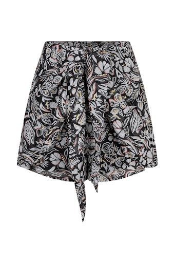 Short Malia is een zwart kort broekje met bloemenprint. De zwarte high waisted short heeft aan de achterkant een elastiek in de taille en aan de voorkant een sierstrik.Materiaal: 100% polyester Model en fit: Het model is 1.74m en draagt maat S. De maat valt normaal Binnenbeenlengte short: 9 cm bij maat S