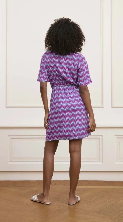 Materiaal: 100% polyesterModel en fit: Het model is 1.74m en draagt maat S. De maat valt normaaLengte jurk: 92 cm bij maat S Jurk Nisha is een gekleurde korte overslagjurk met een mix van paars en blauw als print. De wrap dress heeft een V-hals, korte mouwen en elastiek in de taille. Aan de linker draagkant zit een sierstrik. De gekleurde jurk heeft een losvallende pasvorm.