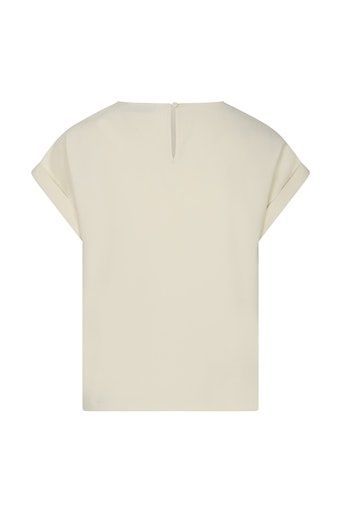 Top Rivka is een ecru top met ronde hals en korte mouwen. De losvallende fit en gladde stof zorgen voor een frisse uitstraling. Een easy item dat je moeiteloos combineert met een jeans of rok.Materiaal: 95% polyester, 5% elastaan Model en fit: losvallend. Het model is 1.74 m en draagt maat S. Lengte top : 61 cm bij maat S