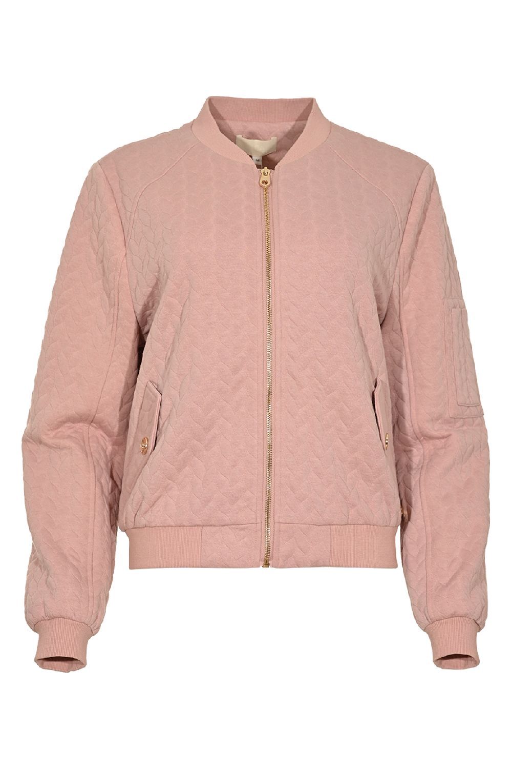 Trendy bomberjasje met een speelse relifprint, afgewerkt met klepzakjes aan de voorkant met hierop goudkleurige knopen voor een stijlvolle touch. Het jasje sluit met een ritssluiting en combineert een sportieve look met vrouwelijke details. Perfect als licht jasje voor het tussenseizoen of als statement piece voor je outfit.kwaliteit:65% polyester 35% viscose - voering 55% polyester 45 viscose