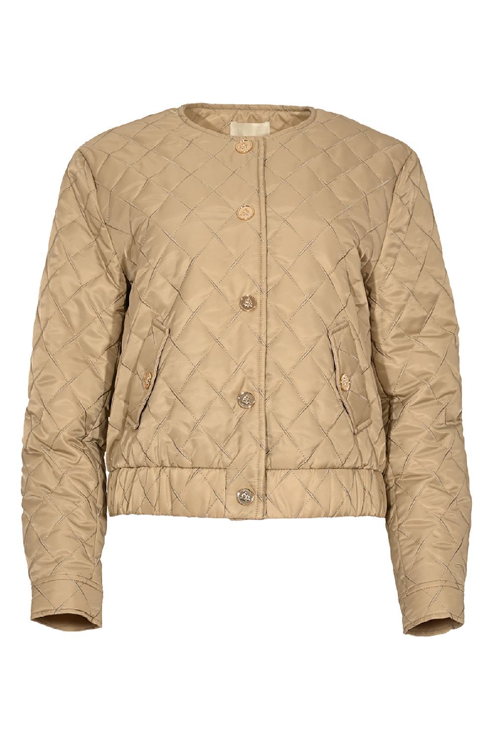 Een zandkleurig bomberjack met een opvallende wyberprint die direct in het oog springt. Het jack heeft een ronde halslijn, lange mouwen en sluit met stijlvolle gouden drukknopen. De steekzakken zijn afgewerkt met gouden knopen, wat zorgt voor een extra chique detail. Perfect voor een casual maar toch elegante uitstraling.kwaliteit:100% polyester - voering 55% polyester 45% viscose
