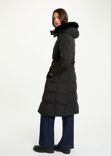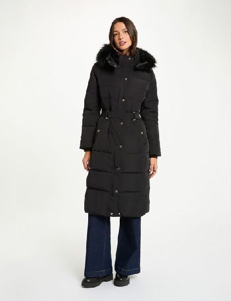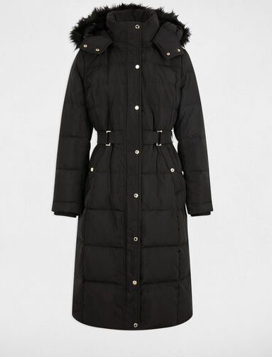 BeschrijvingLange gewatteerde jas met capuchonGetailleerde snitLangehoge kraagLange mouwenRitssluiting aan de voorkant2 paspelzakken aan de voorkant gesloten door een knoopCapuchon met imitatiebont aan de randRiemlussenTon-sur-ton riem met gespElastische tailleCategorie : Donsjassen vrouwKleur : Donsjassen vrouw zwartMaterialen en verzorgingHoofdstof : 100% POLYESTERVoering : 100% POLYESTERAnder deel : 100% SYNTHETISCH (POLYURETHAAN)Synthetisch bont : 36% ACRYL 36% MODACRYL 28% POLYESTERVulling : 50% EENDENDONS 50% EENDENVEERBesnoeiing 2 : 100% POLYESTE