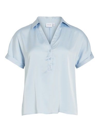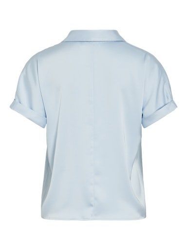 Zie er op je best uit met dit alledaagse item. Satijn is een sterke en stevige stof die niet gemakkelijk kreukt, vooral als het gemaakt is van polyestervezels.Producttype : TopHals : V-HalsMouw : Korte mouwenManchetten : Mouwuiteinden met omslagSluiting : KnoopsluitingPasvorm : Regular fitMateriaal Schelp: 100% Polyester - Gerecycled