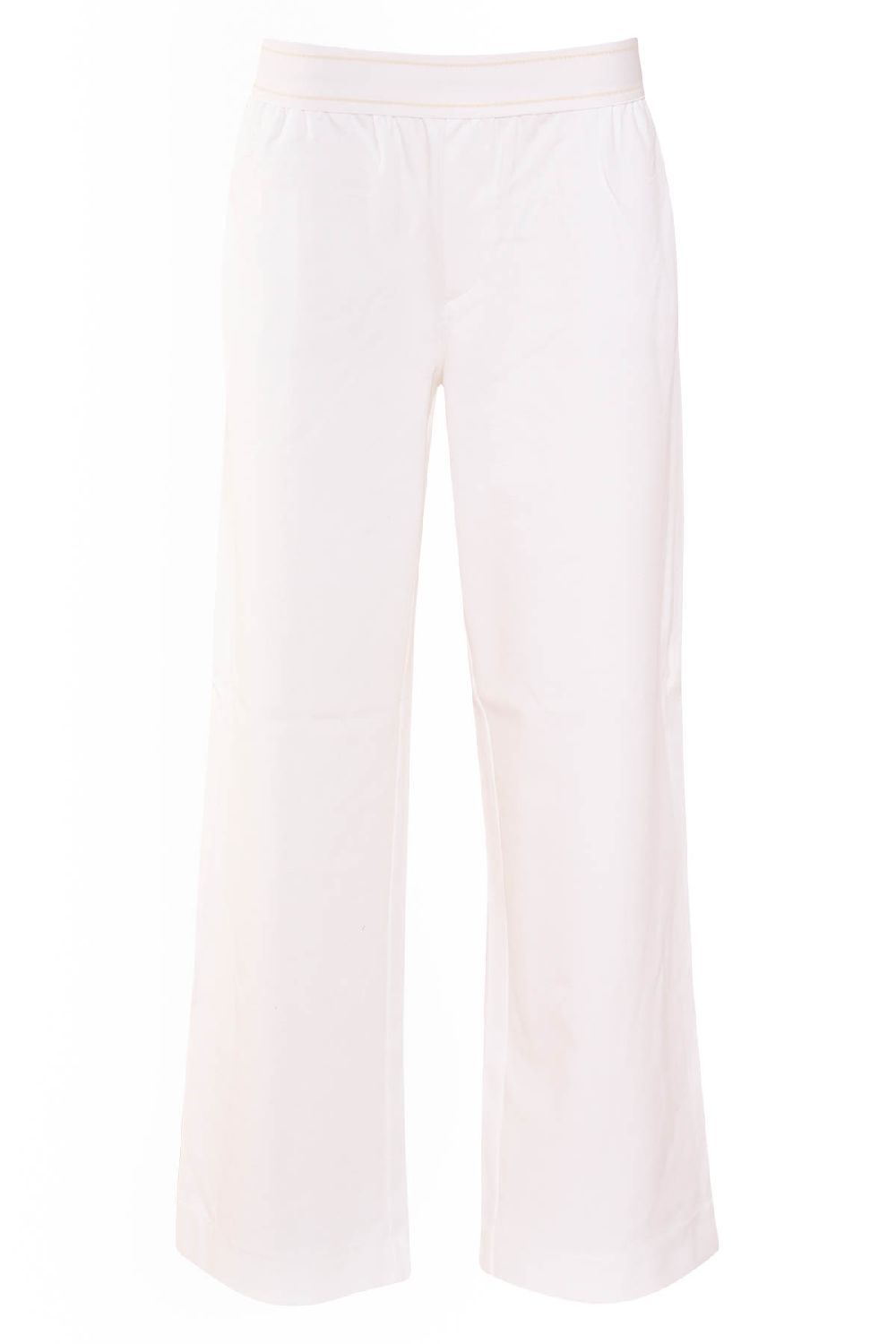 Wide leg broek met een comfortabele elastische tailleband waarin het logo herhaald is verwerkt voor een sportieve touch. Vanaf de boord lopen fijne plooitjes naar beneden, wat zorgt voor een elegante valling. Langs de zijkanten van de broekspijpen is een offwhite bies aangebracht voor een subtiel contrast. De achterkant is afgewerkt met klepzakjes, wat de broek een stoere en tegelijk stijlvolle uitstraling geeft.kwaliteit:Black 100% Polyester Offwhite 45% Polyester 22% Katoen 22% Tensil 2% Elestan