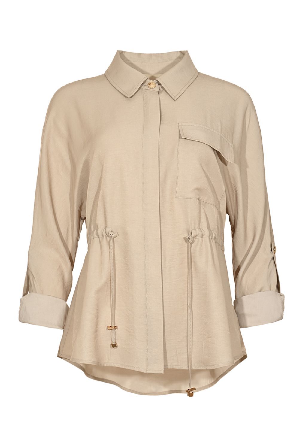 Luchtige jacket in de kleur sand, voorzien van een kraag en een doorlopende drukknoopsluiting met een overslag, waardoor de knopen onzichtbaar blijven voor een strakke, moderne uitstraling. Op de linkerborst zit een klepzak als stijlvol detail. In de taille is een centuur verwerkt waarmee je de jas mooi kunt tailleren. De manchetten zijn afgewerkt met elegante goudkleurige knopen, wat zorgt voor een vrouwelijke en verfijnde look.kwaliteit:70% viscose 30% polyester